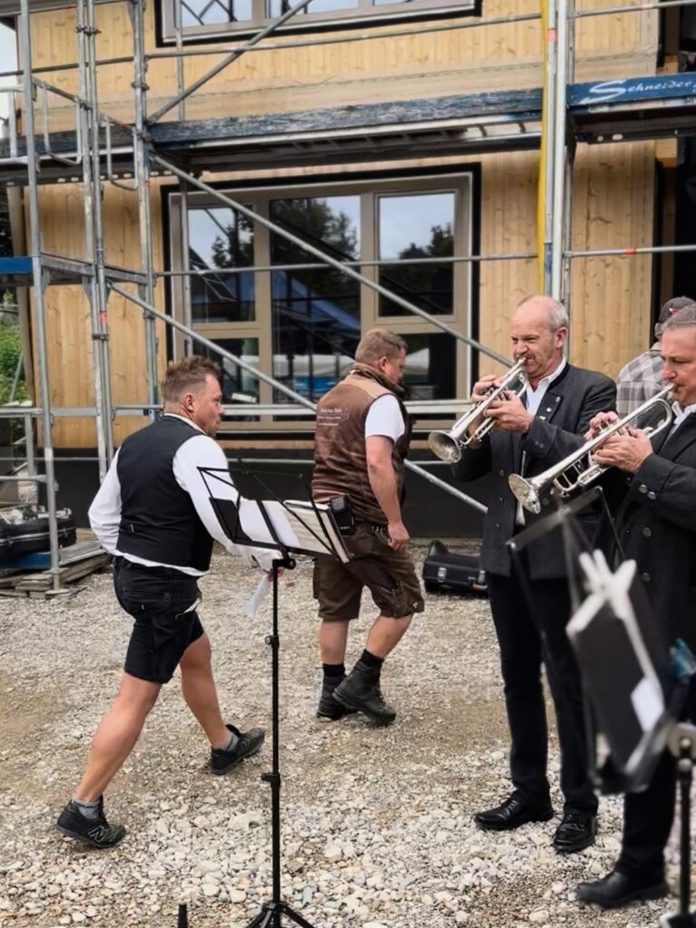 Mitte April haben die Bauarbeiten für die neue Kita begonnen – jetzt wurde an der Kapellenstraße in Traunwalchen das Richtfest gefeiert. Zimmerermeister Markus Huber sprach den traditionellen Richtspruch, eine Delegation der Blaskapelle Traunwalchen sorgte für musikalische Untermalung und Erster Bürgermeister Hans-Peter Dangschat ging in einer kurzen Ansprache auf die Bedeutung dieser Baumaßnahme ein, bevor bei einer gemeinsamen Brotzeit mit den beteiligten Baufirmen gefeiert wurde.