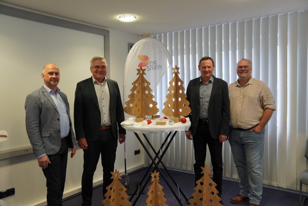 Bild 1: v. links: Richard Wallner, Personalleiter der DS Smith Traunreut, Reinhold Schroll, Zweiter Bürgermeister der Stadt Traunreut, Thomas Schuhbeck, Geschäftsführer DS Smith Traunreut, und Claudio Beilhack, Amtsleiter Kinder, Jugend und Kultur der Stadt Traunreut, bei der Übergabe der kreativen Weihnachtsspende.